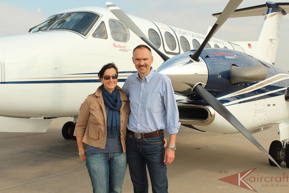 The aircraft looked great! Imagine a new Beechcraft King Air 350i painted white with metallic blue and golden stripes! Our temporary call sign: D-CFMU.